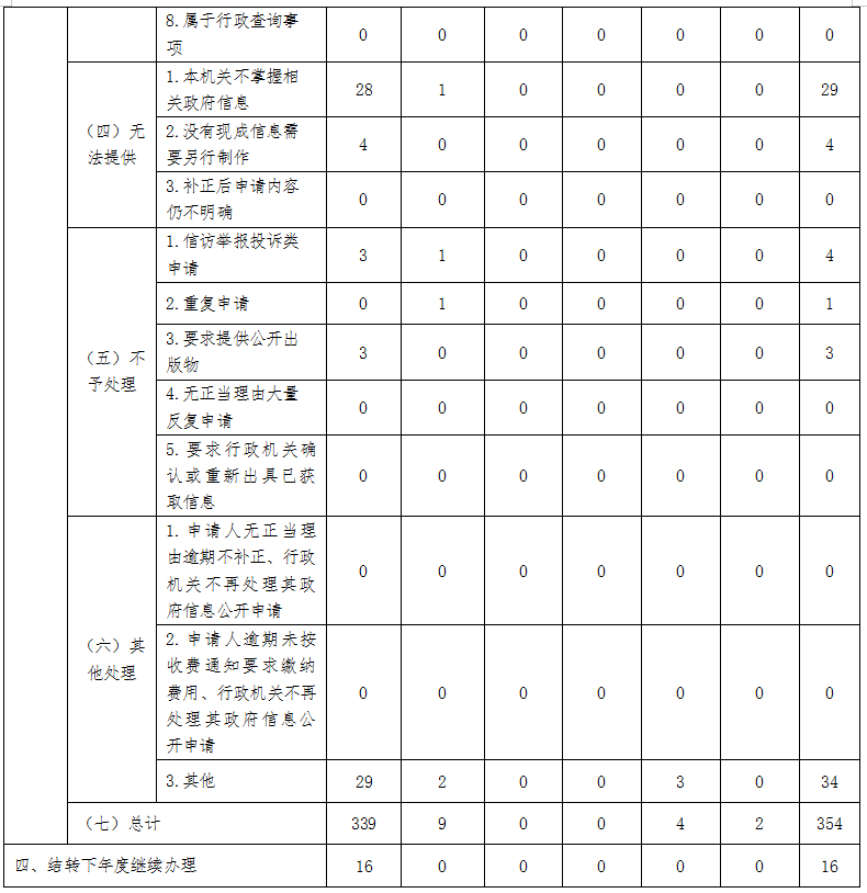 (二)依申请公开情况。全年共收到信息公开申请359件,上年度结转办理11件,已按规定办结354件,结转下年度办理16件。已办结的申请中,予以公开138件、部分公开8件、不予公开133件、无法提供33件、不予处理8件、其他处理34件;因信息公开被申请行政复议0件、提起行政诉讼1件。提起的行政诉讼,为未经复议直接起诉件,其中结果维持1件,尚未审结0件。