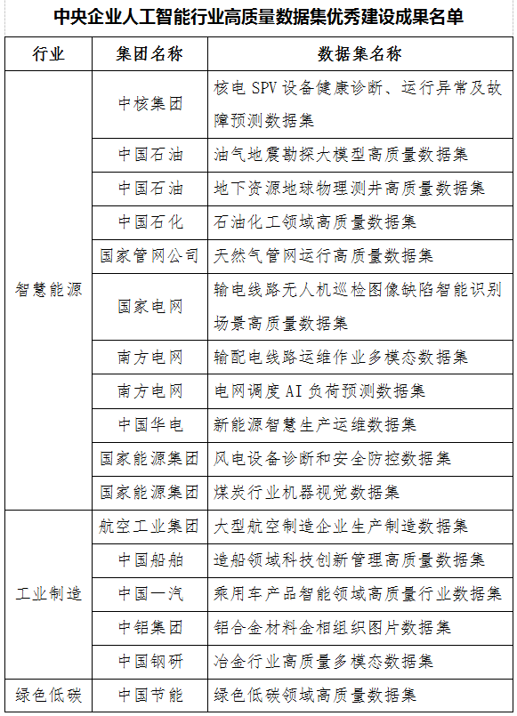 第八届数字中国建设峰会期间,国务院国资委集中发布了首批10余个行业30项央企人工智能行业高质量数据集优秀建设成果;首批成立交通物流、绿色低碳、智慧能源等三大行业中央企业数据产业共同体,后续将梯次成立其他重点行业央企数据产业共同体,深化数据资源开发利用和开放共享,以高质量数据集建设赋能大模型训练、助力高价值场景落地。