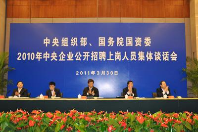 3月30日,中央组织部、国务院国资委召开2010年中央企业公开招聘高管人员和海外人才集体谈话会。中共中央政治局委员、中央书记处书记、中组部部长李源潮指出,要进一步深化国有企业人事制度改革,大力吸引海内外优秀人才,营造有利于人才发挥作用的体制机制和政策环境,为做强做优国有企业提供人才支撑。