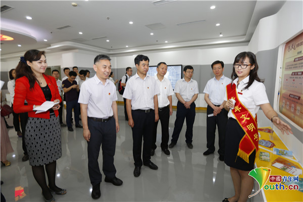 营业厅外张贴着“青年文明号开放周”活动的主题海报、“青年建功十三五,青春献礼十九大”的活动口号横幅,厅内服务人员佩戴着青年文明号绶带、工位处摆放青年文明号服务卡、电子屏连续播放青年文明号主题宣传片,参观代表一到现场就感受到了青年文明号规范的服务和开放周活动的浓厚氛围。