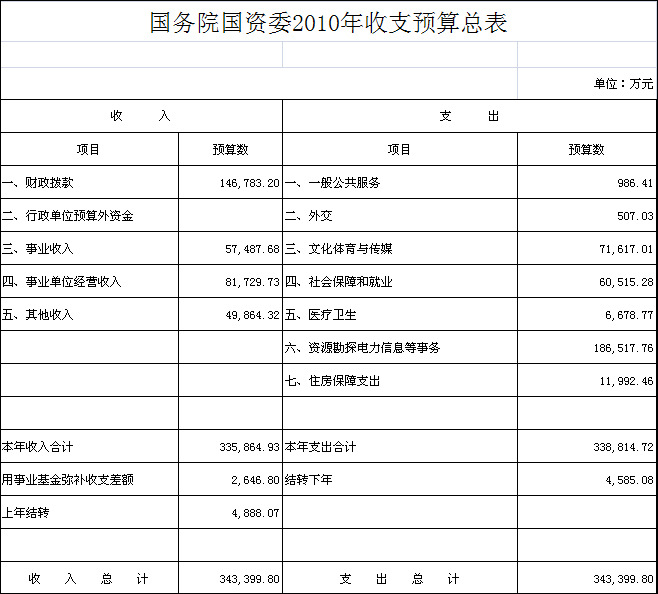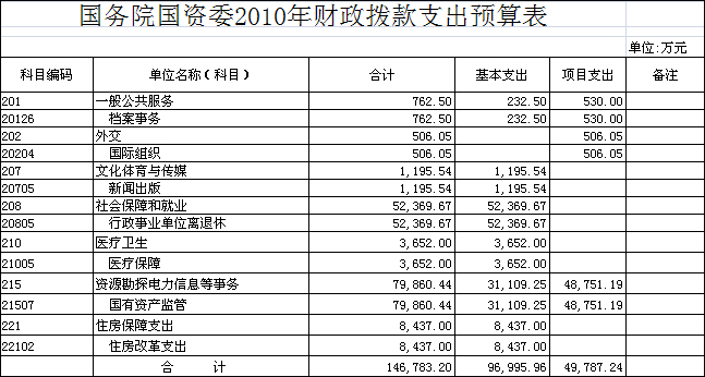 依据《财政部关于批复国务院国有资产监督管理委员会2010年部门预算的通知》(财预〔2010〕204号),2010年国务院国资委部门预算主要指标如下: