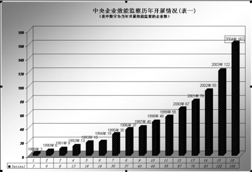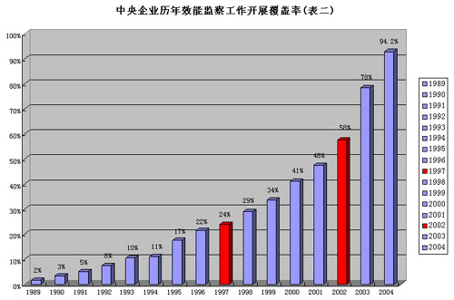 中央企业效能监察工作前后经历了三个阶段:一是1989——1997年,开展效能监察工作的中央企业由3户发展到40户,为起步摸索阶段;二是1998——2002年,开展效能监察工作的中央企业由40户发展到93户,为推广阶段;三是2003——2004年,开展效能监察工作的中央企业由93户发展到162户,为普及发展阶段。两年间中央企业开展效能监察工作新增69家,工作普及率提高了46.8%,而且,正在向各类公司制企业延伸。2003年1月至2004年底,中央企业及其所属二级以上企业效能监察工作共立项23344项,其中:国有独资企业立项20336项、股份制企业立项2877项、中外合资企业立项53项、境外企业立项78项。可以说,目前中央企业效能监察工作领域覆盖了各类公司制企业。(附表一、表二)