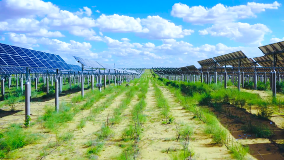 在库布其沙漠腹地,中广核先后建成格桑、白鹭、明德、朔方、卓越、锦帆等6座光伏电站,采用“板上发电、板下修复、板间种树、治沙改土”的方式开展沙漠治理。电站光伏板以阵列形式覆盖在沙丘表面,在阳光下形成蔚蓝色的“能源海洋”。扬柴、沙蒿、沙大旺等抗旱防沙植物在光伏板下茁壮成长,黄芩、红枣树等经济植物向阳而生,在提高经济效益的同时,又能起到防风固沙、防止光伏支架下沉的作用。