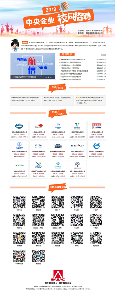9月13日,继2018校招专栏后,国务院国资委网站再次推出2019中央企业校招专栏,首批上线的14家企业累计发布岗位超过2万个,为有志到央企工作的高校毕业生提供一条便捷渠道,为央企广纳英才搭建起沟通桥梁。