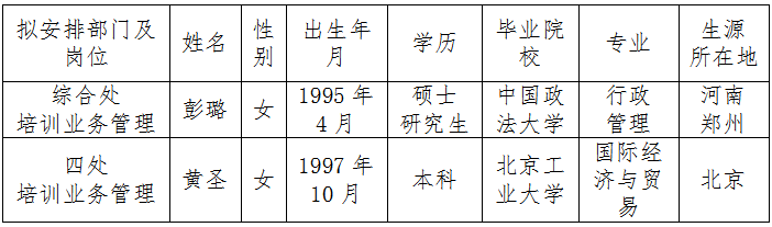 根据事业单位公开招聘相关规定,按照“公开、平等、竞争、择优”的原则,国务院国资委干教中心先后完成公开报名、资格审查、笔试、面试、体检、考察等程序,经研究,拟聘用以下2020年应届毕业生为我中心工作人员,现公示如下: