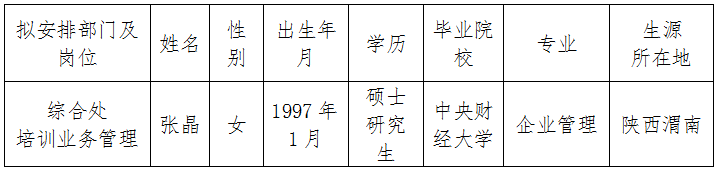 根据事业单位公开招聘相关规定,按照“公开、平等、竞争、择优”的原则,国务院国资委干教中心先后完成公开报名、资格审查、笔试、面试、体检、考察等程序,经研究,拟聘用以下2020年应届毕业生为我中心工作人员,现公示如下: