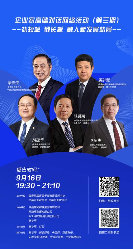 9月16日晚19:30,国资委干部教育培训中心与中国企业联合会、中国企业家协会将联合举办主题为“补短板、锻长板,融入新发展格局”的第三期企业家高端对话网络活动。