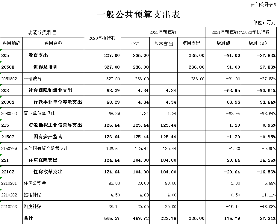 (4)住房保障支出(类)住房改革支出(款)住房公积金(项)2021年预算数为80万元,比2020年执行数减少5万元,下降5.88%。