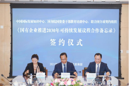 2021年12月2日,国资委干教中心与中国国际发展知识中心、联合国全球契约组织就落实2030年可持续发展议程目标共同签署《国有企业推进2030年可持续发展议程合作备忘录》,签约仪式在京举行。受国资委党委委员、副主任任洪斌委托,国际合作局有关负责同志出席并见证了签约仪式。