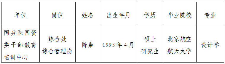 根据事业单位公开招聘相关规定,按照“公开、平等、竞争、择优”的原则,国务院国资委干部教育培训中心先后完成公开报名、资格审查、笔试、面试、体检、考察等程序,经研究,拟聘用以下人员为我中心工作人员,现公示如下: