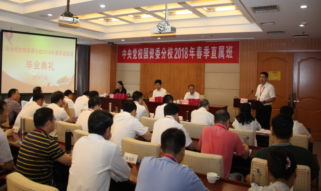 2018年7月13日上午,国资委分校举行2018年春季直属班毕业典礼。国资委干部教育培训中心主任、国资委分校常务副校长孙才森同志出席并讲话,中央党校分校工作办公室黄印秋同志出席,国资委分校副校长黄健同志主持。来自中央企业和国资委的125名直属司局级干部进修班学员和处级干部进修班学员参加了毕业典礼,三位学员代表对三个月的学习做了总结发言。