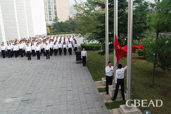 8时,护旗手护送国旗走向升旗台,伴随着雄壮的国歌声,鲜艳的五星红旗迎着朝阳冉冉升起,全体人员面向国旗庄严肃立,高唱国歌,行注目礼。