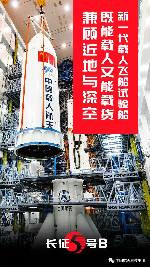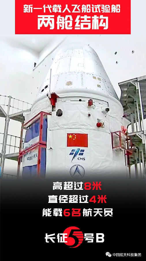 虽说主要任务是建设空间站,但长五B首次飞行的乘客并不是空间站舱段,而是新一代载人飞船试验船。我国“神舟”系列飞船已送11名航天员(14人次)往返近地轨道,但每次只能载3名航天员, 而新飞船最大载客量将翻倍,这得益于新飞船在结构等方面的优化。新飞船与“神舟”飞船同样高8米多,但腰围比神舟“胖了”一圈,直径从不到3米涨到了4米多,神舟飞船的轨道、返回、服务三舱也被优化整合为返回、服务两舱,航天员工作、生活的条件也更舒适。