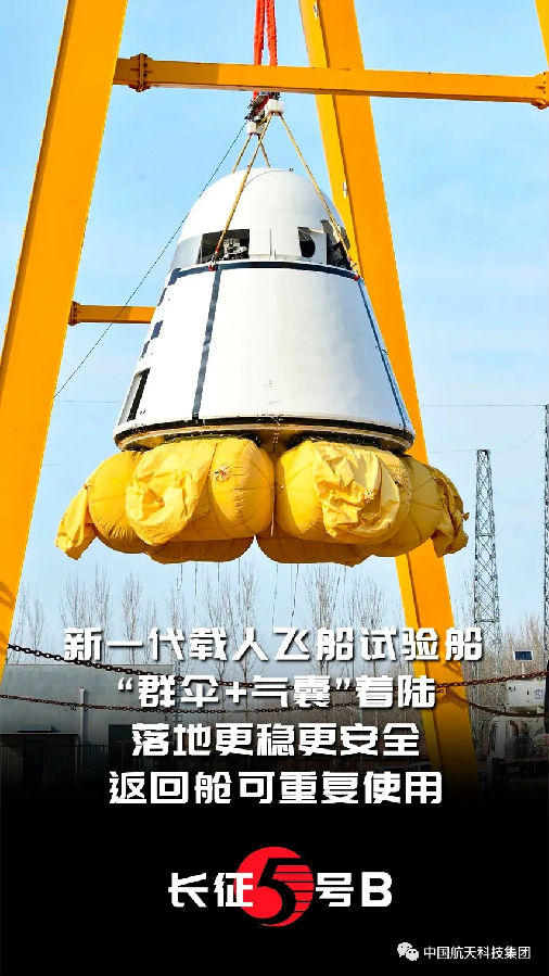 飞船返回舱穿着新研制的“防热衣”返回,头顶群伞脚踩“气球”着陆,航天员落地更稳、更安全,返回舱还能重复使用。