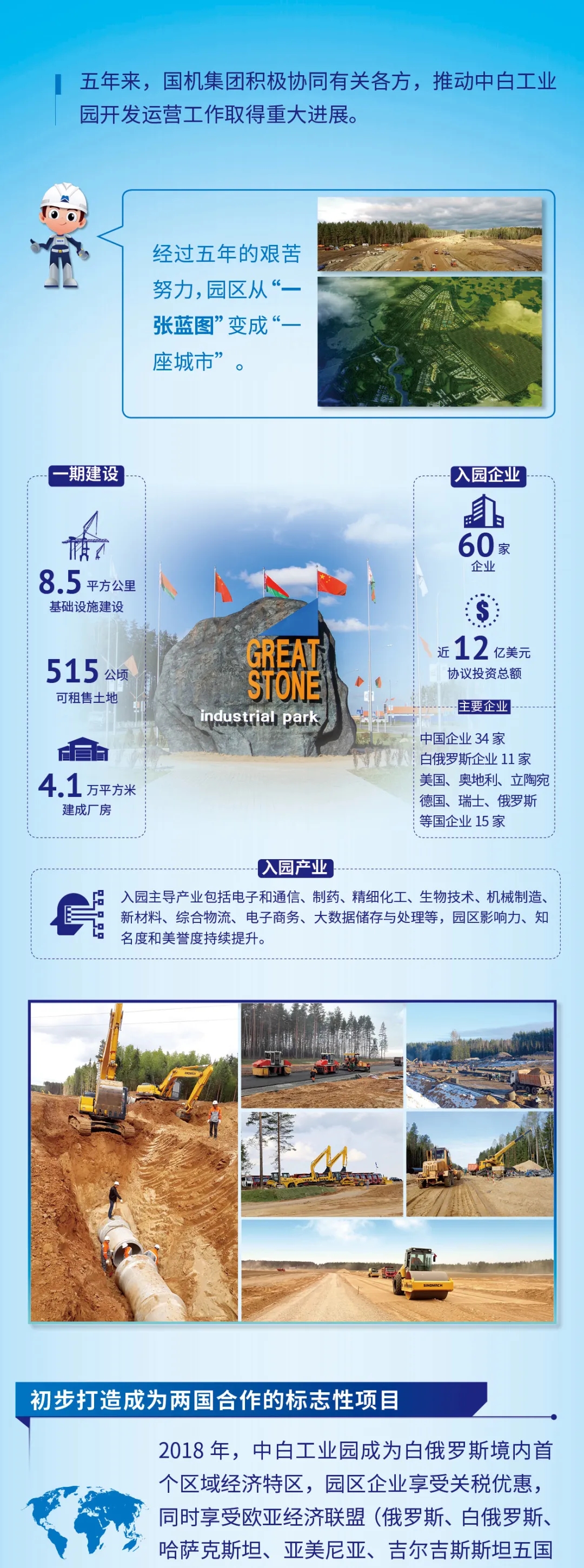 5年后的今天,中白工业园已迈入开发和运营并举的关键阶段,入园企业达60家,协议投资总额近12亿美元。接下来,一图带您详细了解中白工业园的新进展。