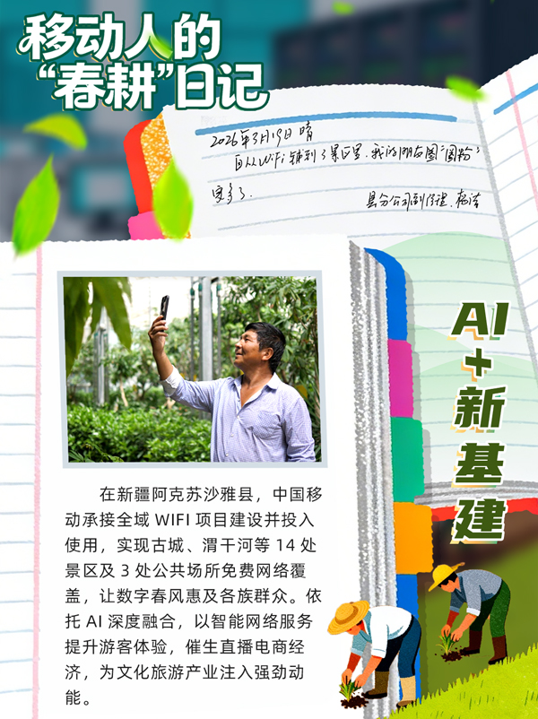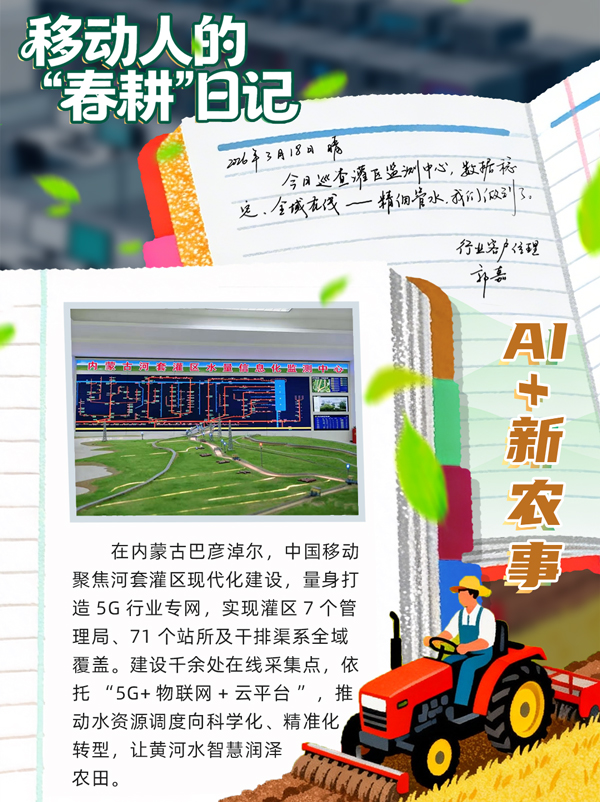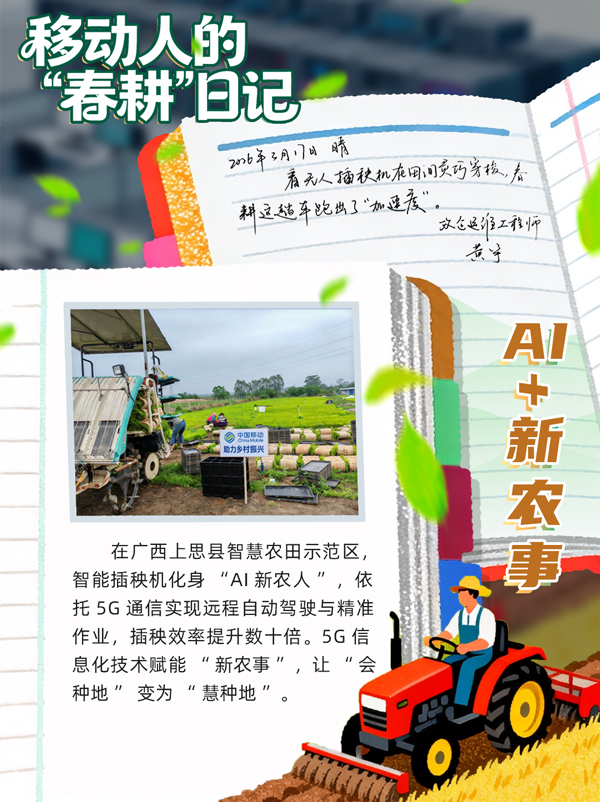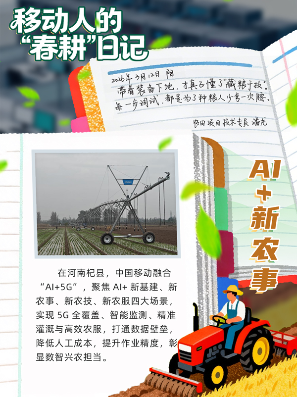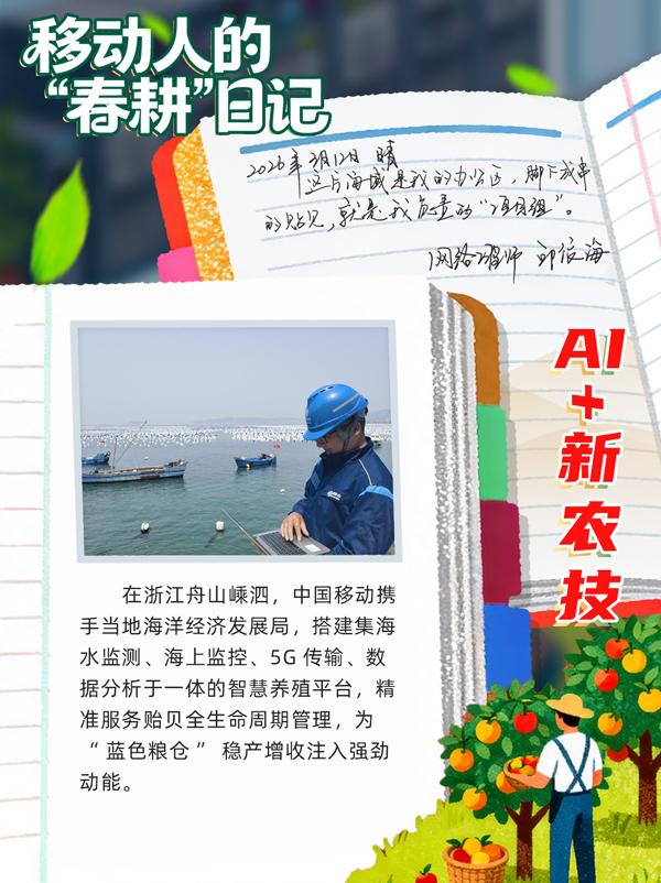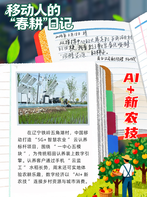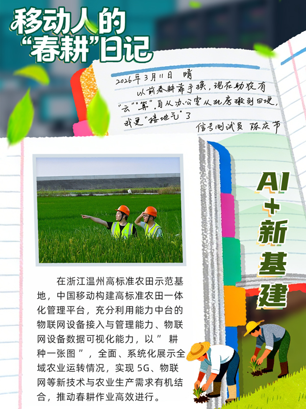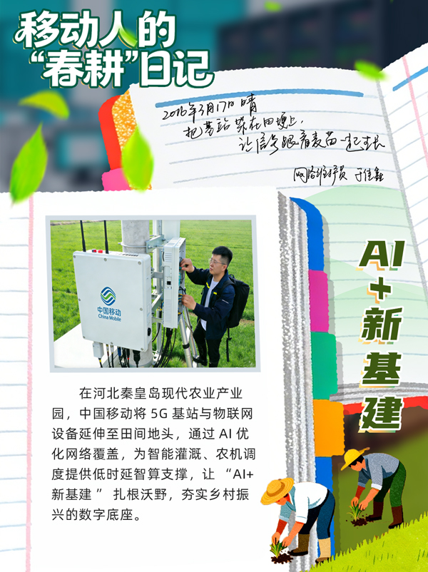 春耕起垄忙,5G连天壤。基站在山顶扎根,数据在云端抽穗,信号在田间分蘖……翻开中国移动工作人员的“春耕”日记,他们把“千万工程”经验落到实处,全力护航春耕生产、助力乡村发展。