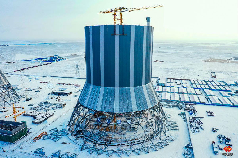 2020年11月21日,内蒙古鄂尔多斯市前旗地区的温度已降至零下20摄氏度。相比冬季因低温结块无法施工的混凝土型塔,1号冷却塔凭借其钢质优势可以继续施工。
