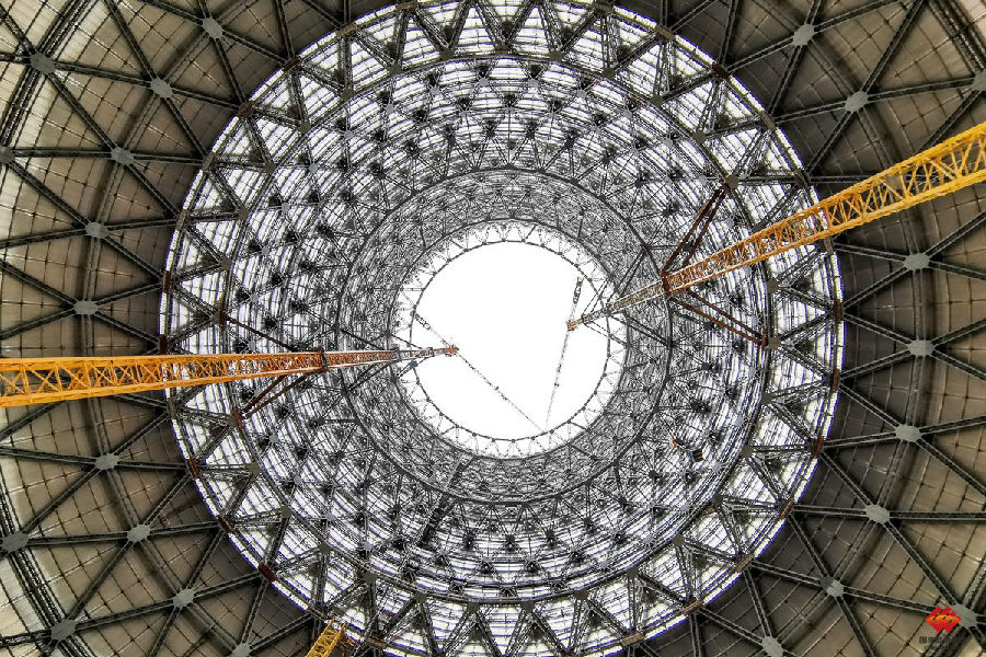 2021年1月9日,1号冷却塔的“裙摆”——展宽平台吊装完成。这标志着该冷却塔已具备吊装散热器的条件。