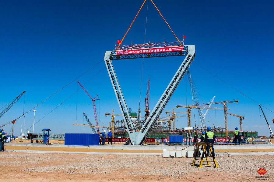 2020年5月28日,自重13吨、垂直高度15米的1号冷却塔首榀钢三角开始吊装。因安装作业难度极大,地面作业人员反复测量牵引,历经12小时,才保证了钢三角的倾斜角度、水平角度等满足指标要求。