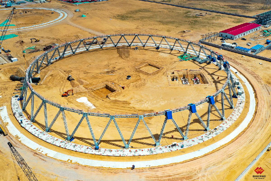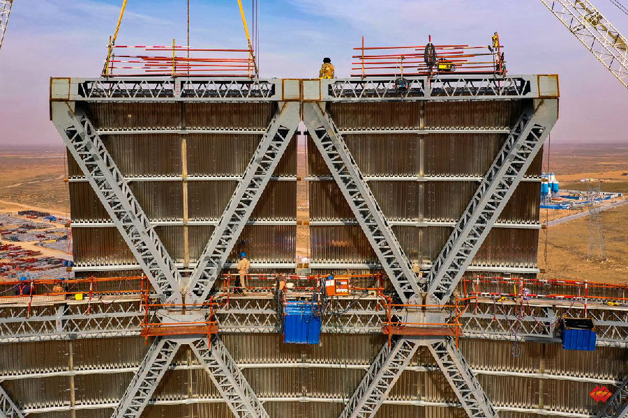 2020年6月15日,1号冷却塔第一层顺利合拢。作为整个冷却塔的基准,32个钢三角全部安装合格,在近500米的周长中,精度要求偏差值不超过5毫米。