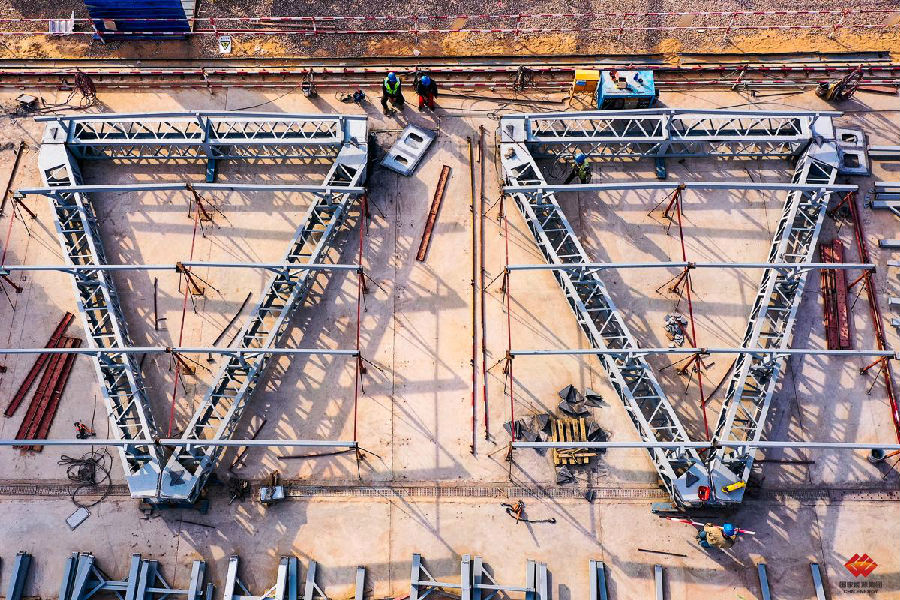 2020年10月1日,施工人员将钢三角杆件按照模板位置拼装焊接成统一的规格,以方便后续安装。