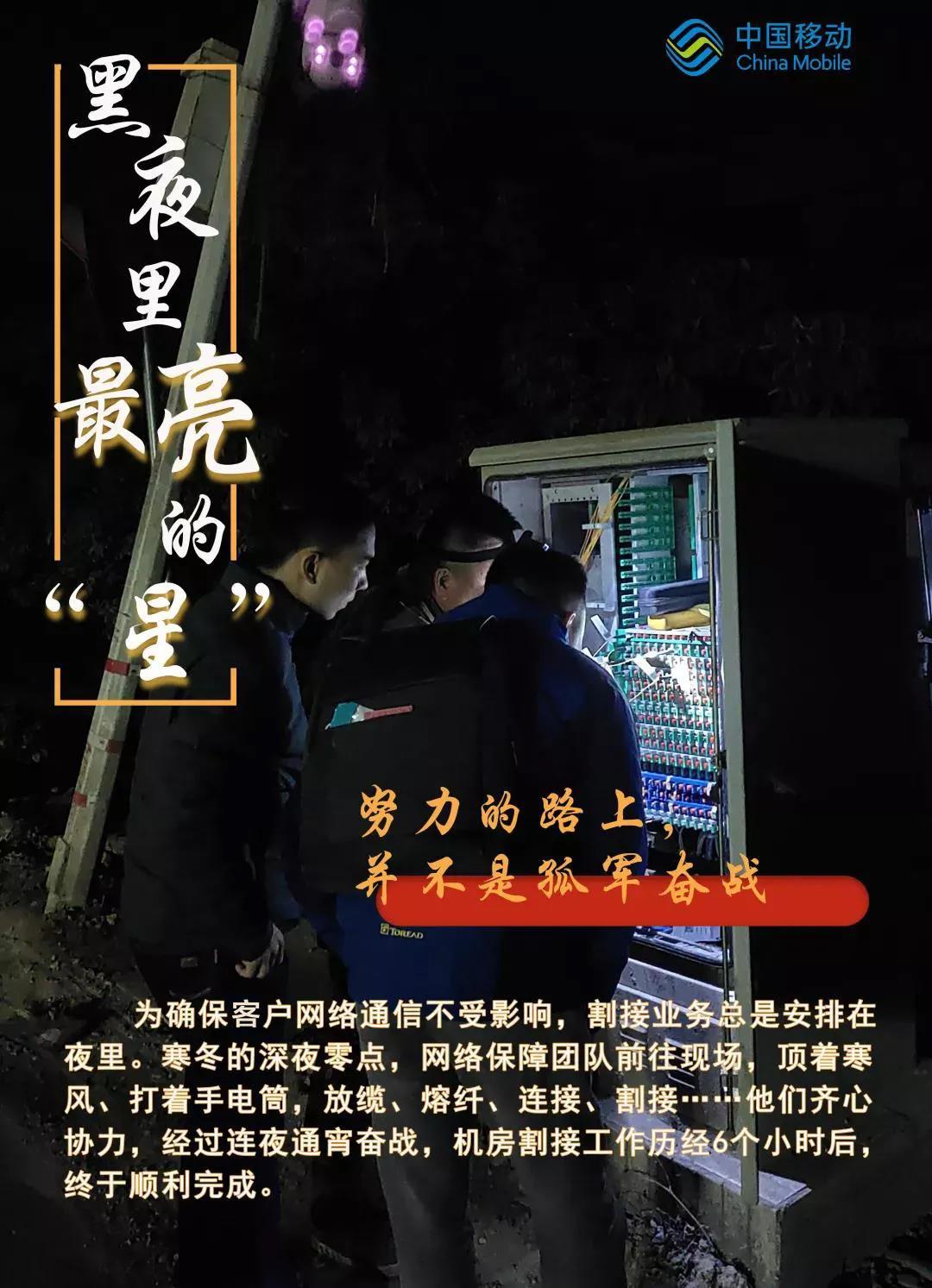 星光不负赶路人,岁月不负有心人,无数个黑夜里的努力,凝聚着移动人对通信事业的热爱与责任,肩负通信使命,奋斗在路上!