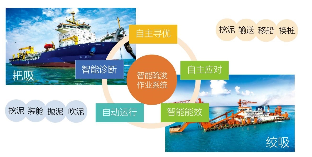 中交集团坚持“智能”理念,自主研发智能疏浚作业系统、智能化能效管理系统和三维可视化监控系统等智能管理系统,推动人工智能、信息化技术与疏浚船舶制造深度融合。自主研制挖泥船控制软件支撑平台,突破复杂系统基础控制软件关键技术国外封锁,掌握基于国产操作系统及CPU下控制软件基础平台研发、挖泥船综合控制等关键技术以及基于国产生态的智能集成控制系统研发设计,为实现智能疏浚奠定软件基础。采用人工智能和疏浚机理相结合的方法,加强超大型耙吸挖泥船上智能化控制系统总体分析、自动作业与安全控制系统研制、自主寻优智能系统研制、智能诊断系统研制、能效智能管理系统研制,通过AI技术应用实现“一键疏浚”和能效智能优化,典型工况下可进行“无人疏浚”,提升疏浚安全和效能。