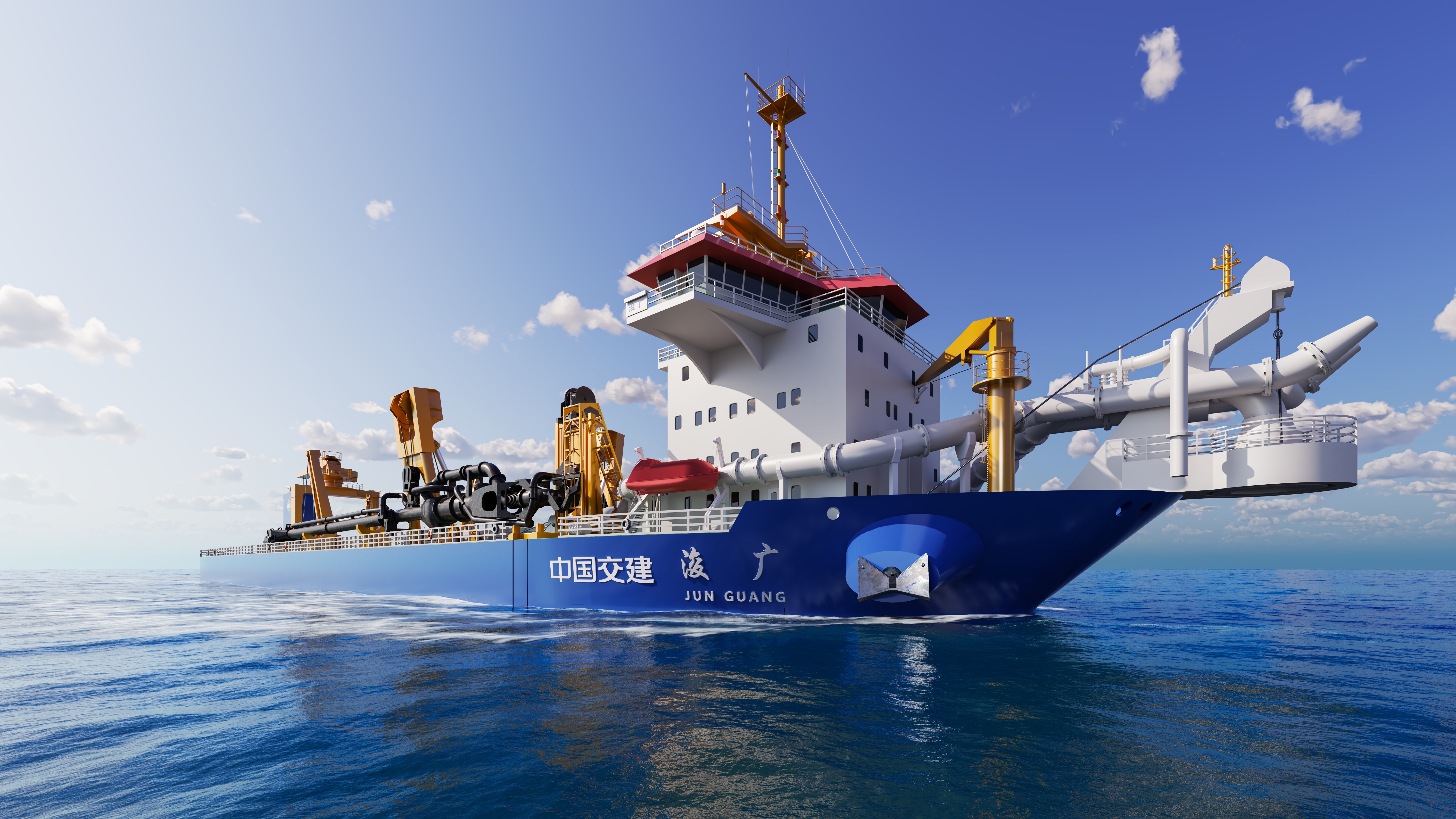 为响应国家“海洋强国”“制造强国”“美丽中国”战略,加快推动战新产业高端疏浚装备发展,打造疏浚行业国际先进水平的“大国重器”,中国交通建设集团有限公司(简称中交集团)推进战新产业“百大工程”超大型耙吸挖泥船智能疏浚装备国产化工程项目,自主建造世界领先、装载量亚洲第一的35000立方米舱容等级耙吸挖泥船,填补我国在30000立方米以上舱容耙吸船的空白,突破国外对我国大型耙吸船建造和智能疏浚装备的技术封锁,推动我国疏浚行业向高端化、国际化发展,有力发挥科技创新、产业控制、安全支撑作用。