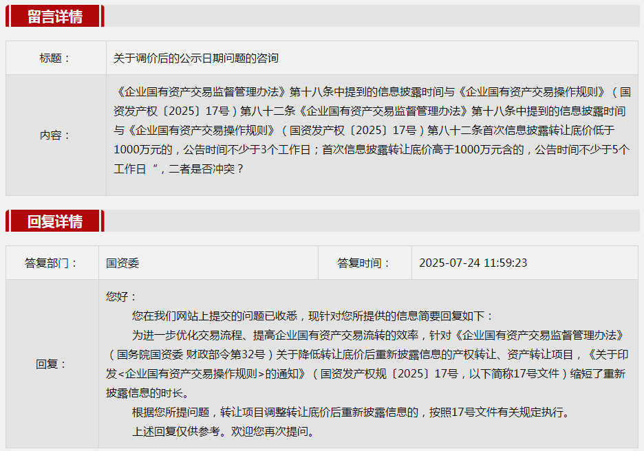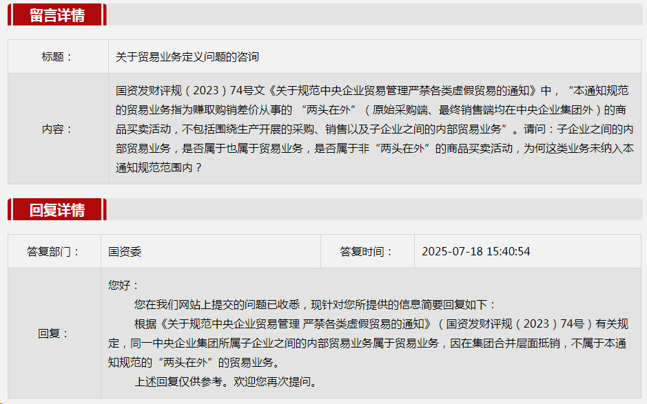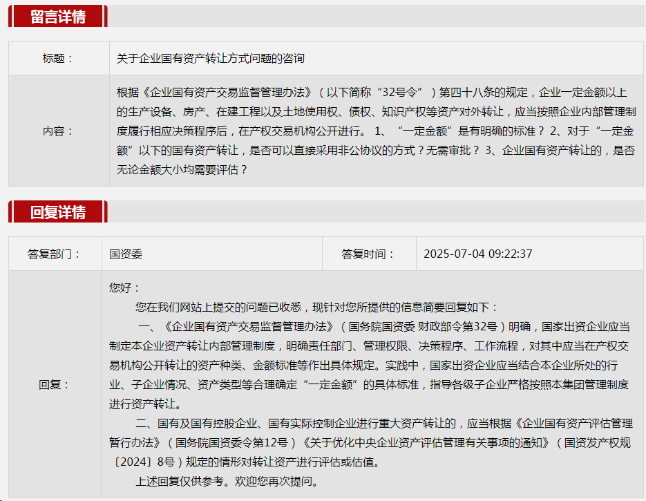 2025年7月国务院国资委网站政务咨询栏目部分网友提出的咨询,我们初步做出了认真的回应,现选择五条关注度高、点击量高的问题,再次推荐分享。