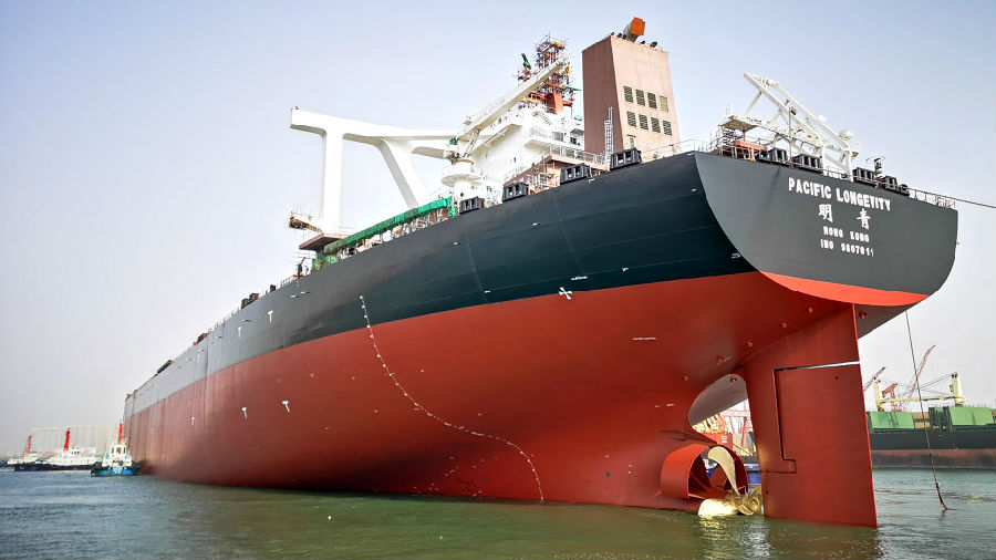 近日,由中船重工所属中国船贸与武船集团联合出品的第四艘40万吨级矿砂船“明青轮”成功命名交付。该船长362米,型宽65米,型深30.4米,保证航速14.5节,续航里程达25500海里,相比上一代同类船型油耗降低了18.8%,装卸货时间缩短了一半,可不间断完成地球上任意两个港口间运输任务,一次补给就能完成环球航行,更加高效环保。该船的成功交付对我国铁矿石运输安全保障具有重大意义。