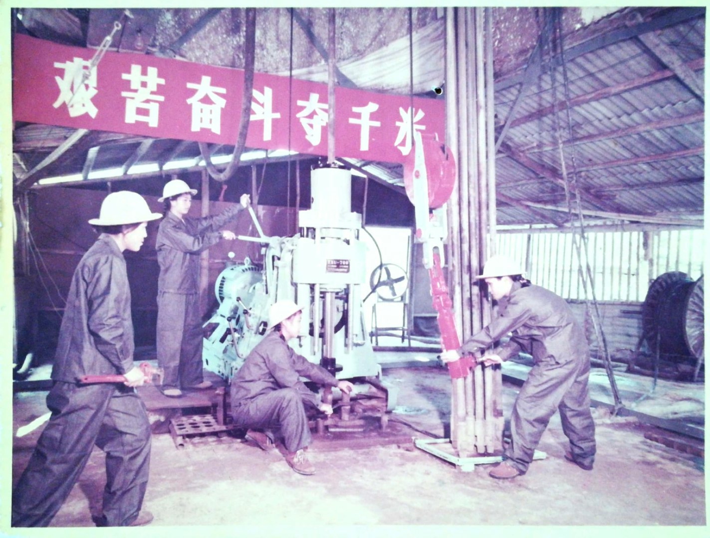 上世纪70年代中国煤炭地质总局响应“妇女能顶半边天”的号召,首创了“三八钻机”,这是1970年钻探项目上女钻工正在艰苦奋斗勇夺千米作业。