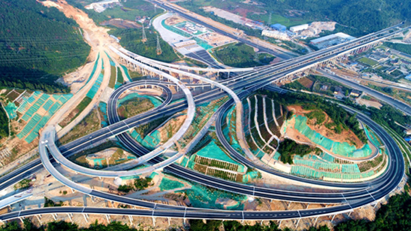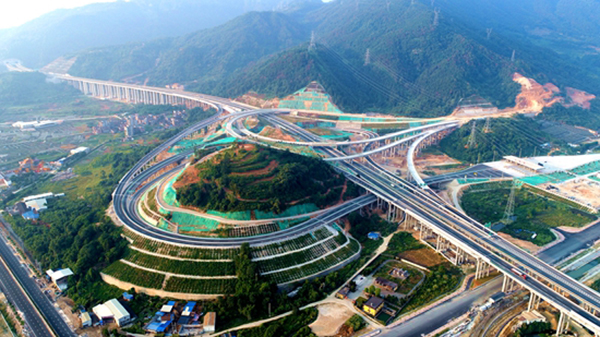 据项目经理李保印介绍,面对复杂的施工环境和技术难题,项目部采用BIM建模、智能张拉压浆系统、螺旋管贝雷梁支架及变形监控与预警体系等工艺工法,解决了匝道桥建设难题;为确保制架梁任务的圆满完成,六都互通桥梁拼宽段设置了跨墩龙门提梁机,配合多台大吨位汽车吊和架梁机联合作业,解决了运梁通道修筑困难、险峻的地理形势和施工干扰等问题;施工中采用了砂石分离机、脉冲式除尘器、智能焊接机器人等设备,制定了环境保护及水土保持管理办法,使整个互通与周边的苍山翠岭浑然一体,起到了良好的环境保护成效。