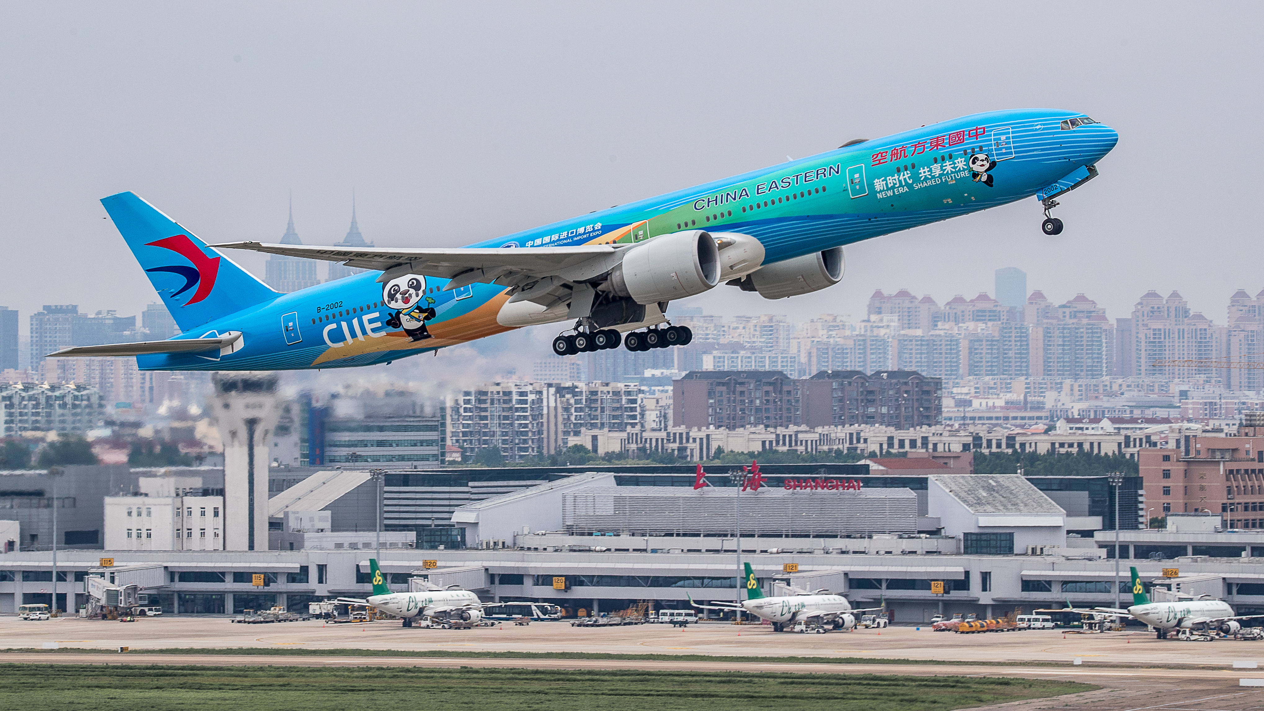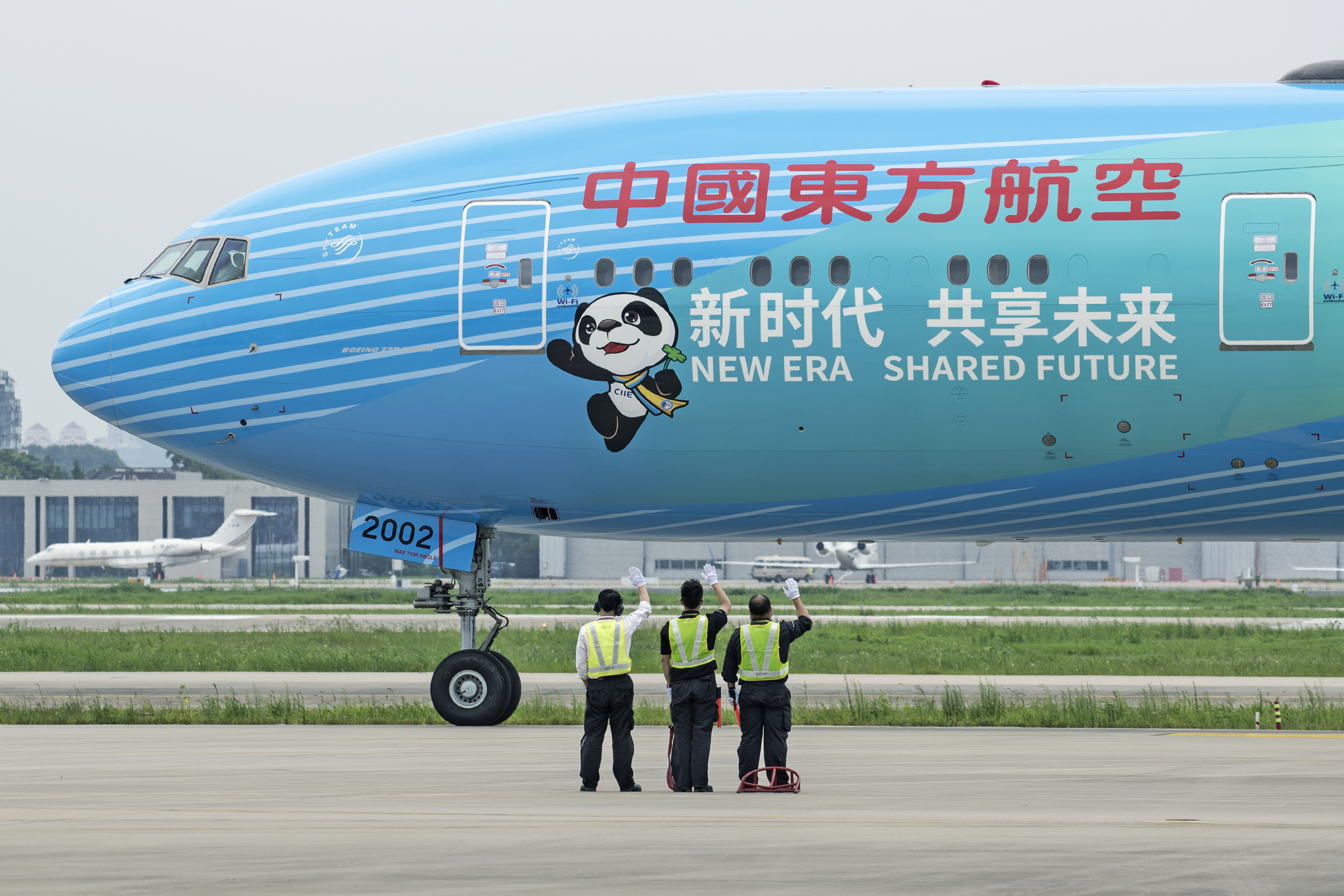 全球首架“进博号”选定东航目前载客量最大、航程最远、搭载全球领先客舱服务系统的国际远程旗舰宽体机——波音777-300ER进行喷涂,这也是东航该机型的首架彩绘机。整个彩绘以进博主色调为基色、吉祥物“进宝”活泼形象跃然其上的展现形式,实现了进博形象和飞机美学的完美融合。