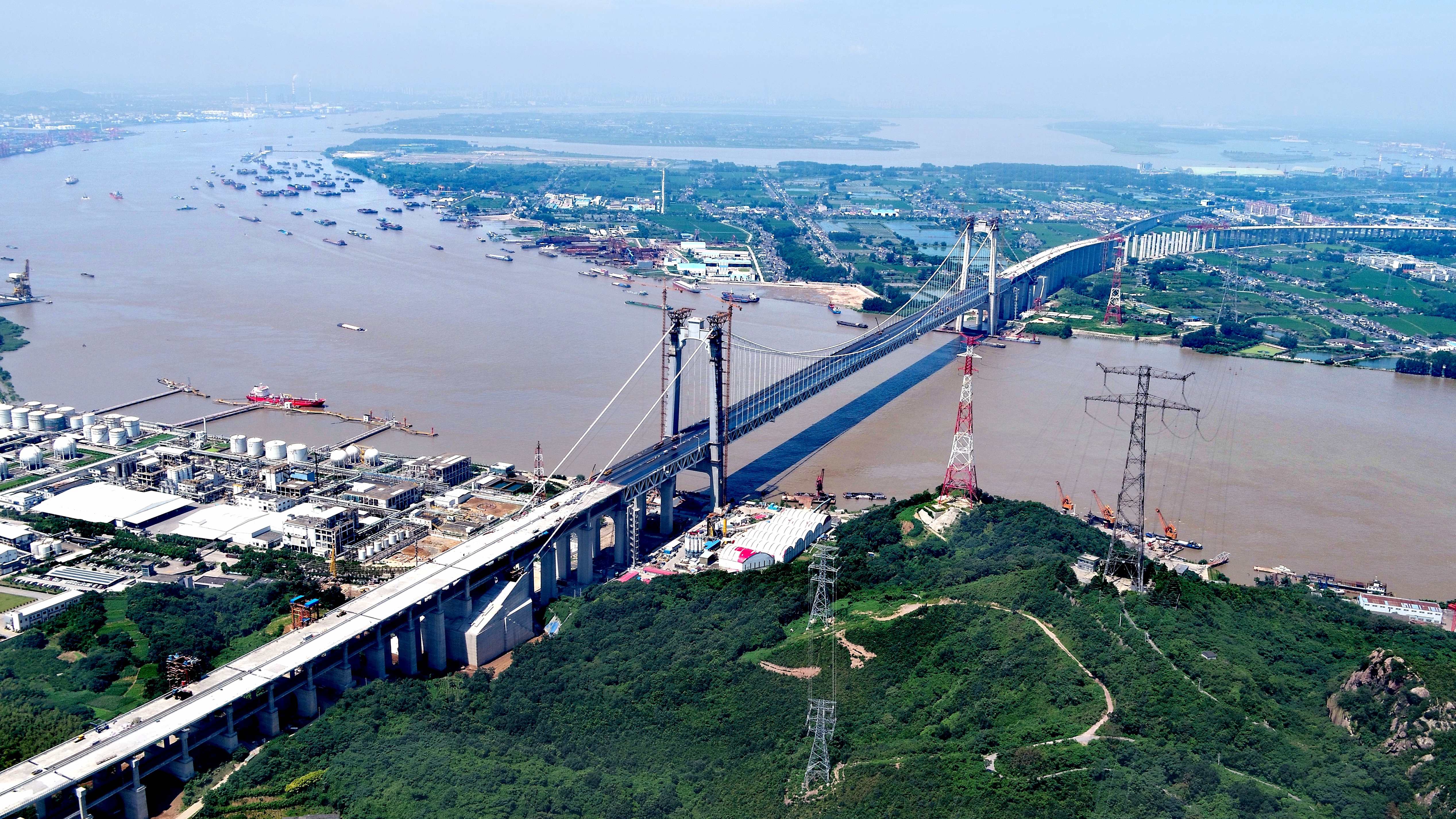 五峰山长江大桥全长6.409千米,主跨1092米,上层为双向八车道高速公路,设计时速为100公里;下层为四线高速铁路(预留两线),设计时速为250公里,是我国首座公铁两用悬索桥。
