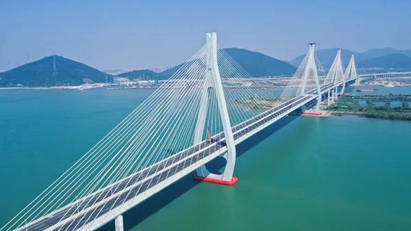 据悉,洪鹤大桥是连接珠海香洲区和金湾区的过江通道,起于香洲区南屏镇洪湾枢纽互通,对接港珠澳大桥连接线,终点与鹤港高速相接,路线全长约9.65公里,采用双向六车道标准建设。大桥主桥由两座主跨500米双塔双索面叠合梁斜拉桥串联而成,两座斜拉桥均采用“水滴形”钢筋混凝土桥塔、钢—混凝土结合主梁、钢绞线斜拉索等结构,较好地满足桥址处强风、强震、软土及海洋腐蚀环境下的使用要求。