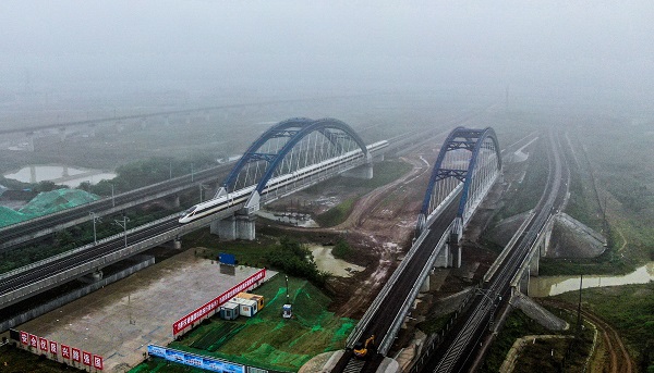 “引江济淮工程航道下穿既有沪蓉高铁,要满足通航条件,必须新建线路,让沪蓉高铁搬家。”项目常务副经理张新意介绍说。此次改建涉及线路4540米,拨接时出动机械设备840余台套,具有施工时间长、影响面积大、涉及专业多、时间要求紧、验收标准高等特点,是国内首例高速铁路改建工程双线拨接,也是引江济淮工程全线重难点和控制性工程。
