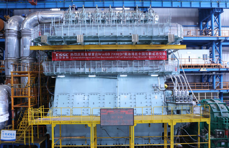 4月28日,全球首台WinGD 7X82DF型双燃料主机在中国船舶集团有限公司旗下中国船舶重工集团柴油机有限公司(以下简称中国船柴)成功交验。该主机最大持续功率2.25万千瓦,重达928吨,满足国际海事组织TierⅢ排放标准,将安装在大连船舶重工集团有限公司为中远海运能源运输有限公司建造的31.8万吨油轮上。