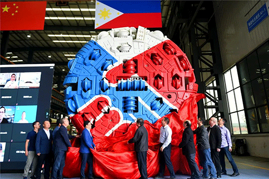 现场,掘进机刀盘涂装底色使用菲律宾国旗白、红、蓝三色,图案设计成两只紧握的手,设计元素体现了中菲双方以礼相待、平等诚信的友谊和展开合作的美好愿景。
