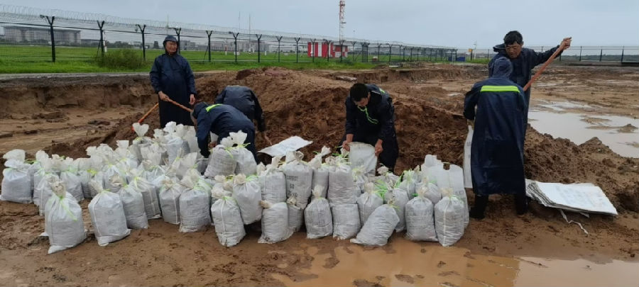 民航机场建设集团所属民航建工参建的郑州新郑国际机场三期扩建工程项目和郑州湖畔云庐项目第一时间成立防汛应急工作小组,召开会议进行防汛部署。在机场三期扩建工程飞行区,组织现场人员冒雨在飞行区围界附近进行防汛抢险,灌装防汛沙袋,修复飞行区附近破损道面和坍塌沟槽。在湖畔云庐项目部,组织工作人员架设水泵、铺设水管、装填防汛沙袋,对存在隐患的部位进行紧急处理。