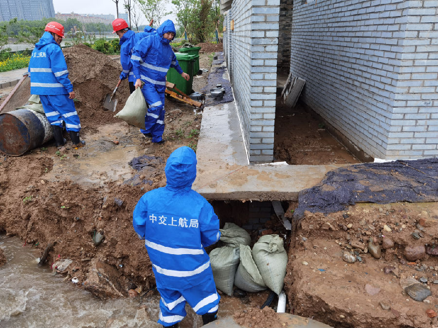 7月20日,中交上航局灵宝项目驻地附近的建业小区以北工段排水系统超负荷运转,出现雨水倒灌现象,危及项目已建成区域和附近居民安全。项目部启动防汛应急预案并立即开展抢险工作,开挖排水沟进行导流,对冲榻部位装填沙袋,保障工地建成区及小区居民的安全。
