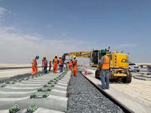日前,中国电建承建的阿联酋阿提哈德铁路货运站项目(2F2标段)永久铁路工程铺轨作业在鲁维斯货运站正式启动。