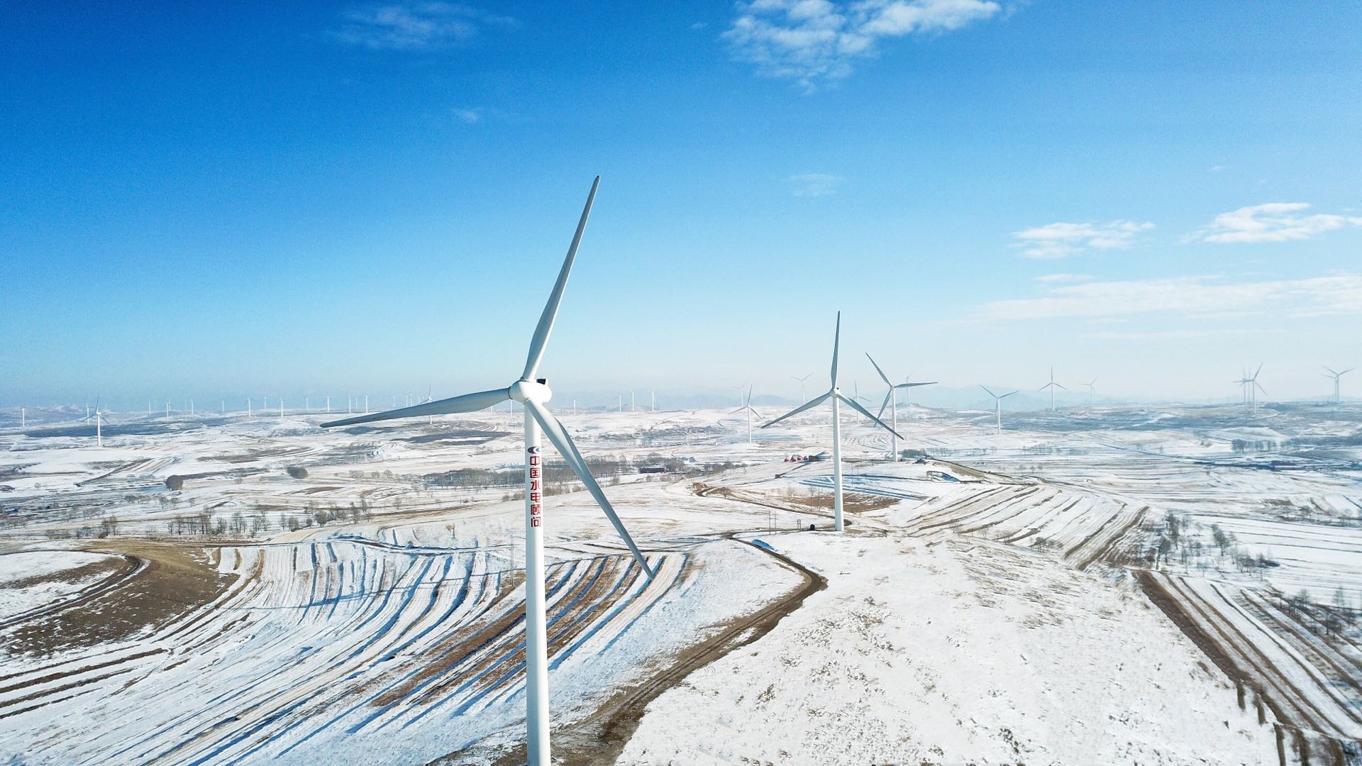 刚下过几场雪,一台台风机在冰天雪地中耸立入云呼呼旋转,一张张光伏板追逐着太阳闪耀着银光,带来源源不断的电能,这就是冬奥绿电的来源。