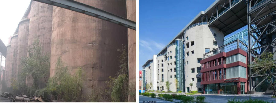 北京冬奥组委首钢办公区由首钢老工业遗存筒仓、料仓、联合泵站、转运站等联合改造而来,被称为“旧瓶装新酒”的典型。西十筒仓外墙雕刻着大大小小的镂空圆孔,保持混凝土工业建筑的本色。