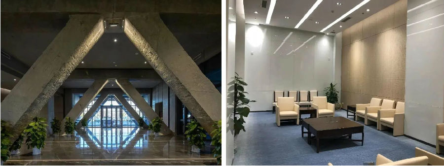 项目团队在保留原有结构和框架的基础上,通过使用碳纤维、钢板和阻尼抗震撑等手段对原有主体结构加固以适应新的功能需求,在材料上使用石英板面层作为幕墙主要材料,内装区域选用穿孔吸音的木饰面板,保障隔音和美观需求,达到绿色建筑星级标准,充分彰显“绿色办奥”理念。