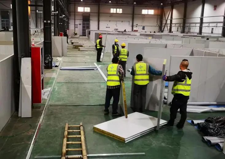 4月2日下午,建设团队火速集结328人队伍在当日晚8点投入建设共青方舱医院。该方舱医院面积4000平方米,可容纳床位432个。目前电箱基础、放线、场地清理破土等工作及医护一脱二脱更衣室集装箱拼装已顺利完成,隔离仓、生活配套设施完成90%,强弱电、给排水、消防系统、通风排烟系统完成80%,医疗生活废弃物处理站等配套设施施工完成50%。