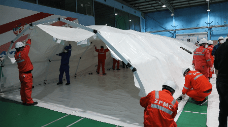 4月4日上午,振华重工接到建设气膜方舱的任务,紧急召开抗疫援建专项会议,长兴分公司迅速响应,抽调近百人的队伍火速支援上海气膜方舱建设。在确定气膜方舱建设方案后,振华重工仅用了4个小时就完成队伍组建及后勤保障工作。通过不间断作业并同步优化作业方案,最终仅用6小时就提前完成援建任务,较厂家预估的作业时长减少一半,在有效减少援建队、医疗队共区伴随的同时,也为后续进行医疗气密试验、负压实验预留了充足时间。