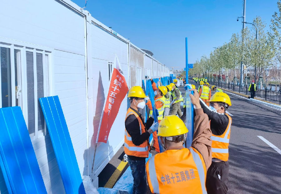 “快些、再快些!”在青浦高新方舱医院建设现场,中铁十五局550余名工人顶着35摄氏度高温,吃盒饭,打地铺,全力抢进度。8天以来,他们已参与建设7座方舱医院。在华东区域总部协调下,中铁十一局、中铁十五局、中铁二十四局、上海院和中铁十八局、中铁建设、中铁城建等单位连续奋战十余天,在上海市及紧邻的江苏省昆山市建成20余座方舱医院和临时隔离点,总面积近18万平方米,能够提供床位1.5万多张,多个防疫人员、物资集散中心的建设,极大地缓解了医疗资源紧张局面。