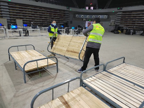 华润置地志愿者在上海静安体育中心方舱医院作业