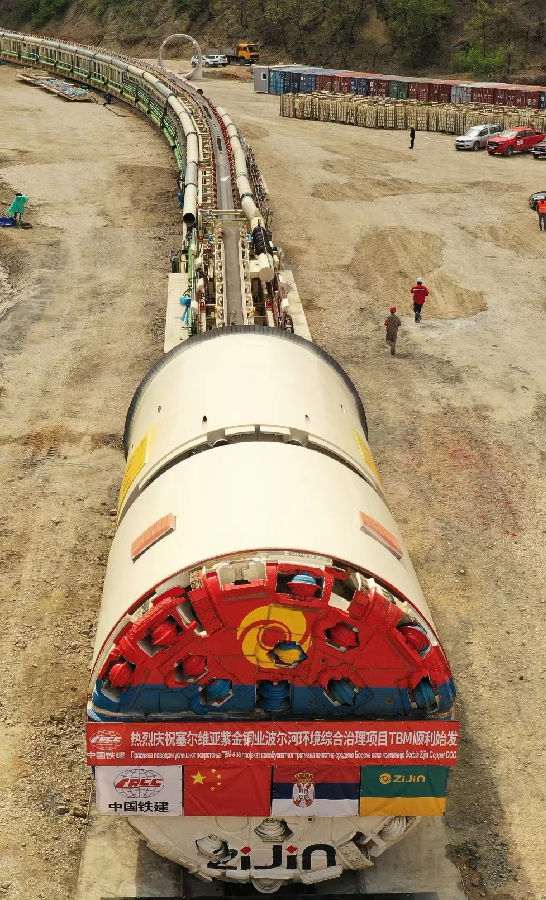 据悉,这台掘进机整机长310米、重1600吨,用于塞尔维亚紫金铜业波尔河环境综合治理项目。掘进过程中将下穿铁路,并从矿区旁侧穿过,需穿越多条断层破碎带,施工条件较复杂。隧洞全程掘进8324.23米,埋深15米至220米,隧洞开挖断面直径5.49米。