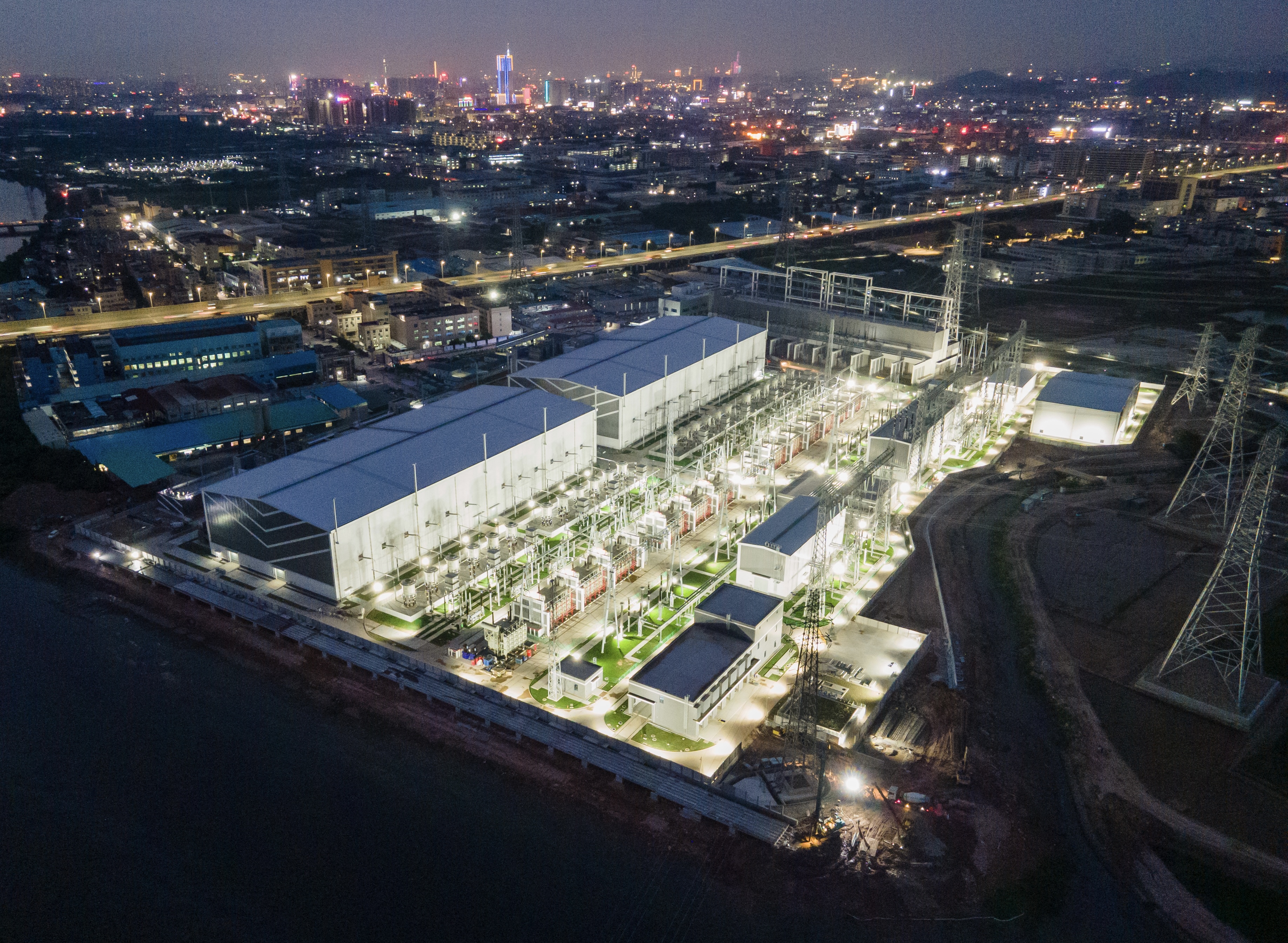 夜色中的粤港澳大湾区直流背靠背电网东莞工程